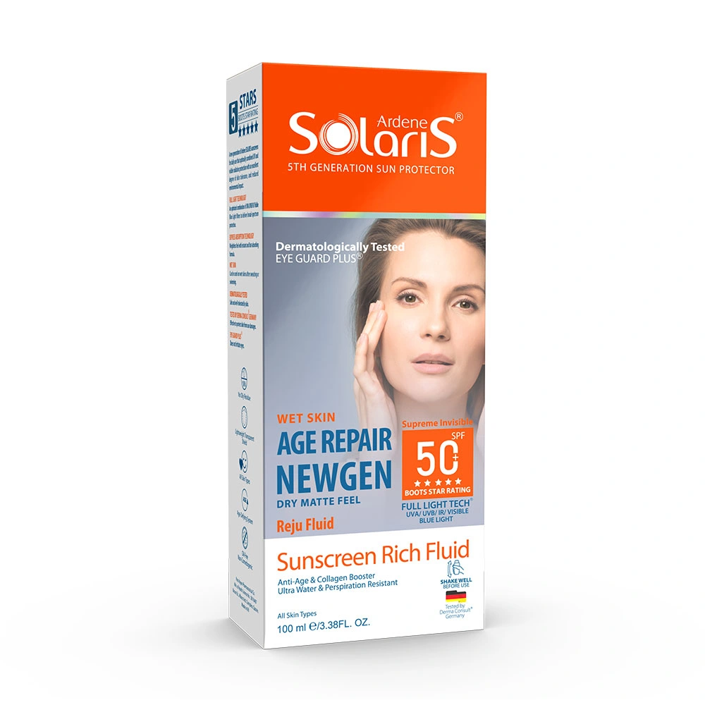 فلوئید ضد آفتاب ضد چروک فاقد رنگ آردن سولاریس مدل AGE REPAIR NEWGEN با SPF50، یک محصول تخصصی برای محافظت از پوست در برابر اشعه‌های مضر خورشید، کاهش چین‌وچروک و بهبود خاصیت ارتجاعی پوست است. این ضد آفتاب با فرمول سبک و رنگ طبیعی، علاوه بر ایجاد پوشش یکنواخت و طبیعی، به حفظ سلامت و شادابی پوست کمک می‌کند.