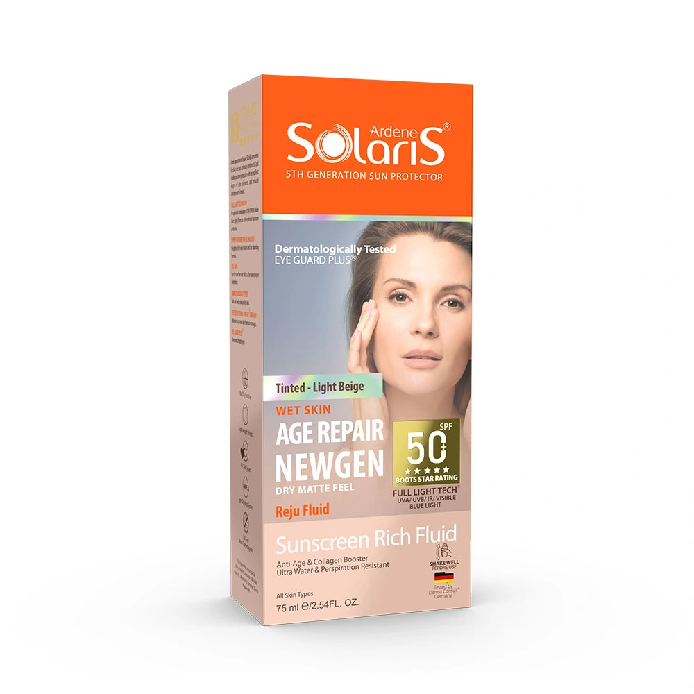 با استفاده منظم از فلوئید ضد آفتاب ضد چروک رنگی آردن سولاریس AGE REPAIR NEWGEN، پوستی محافظتشده، جوان و شاداب خواهید داشت.