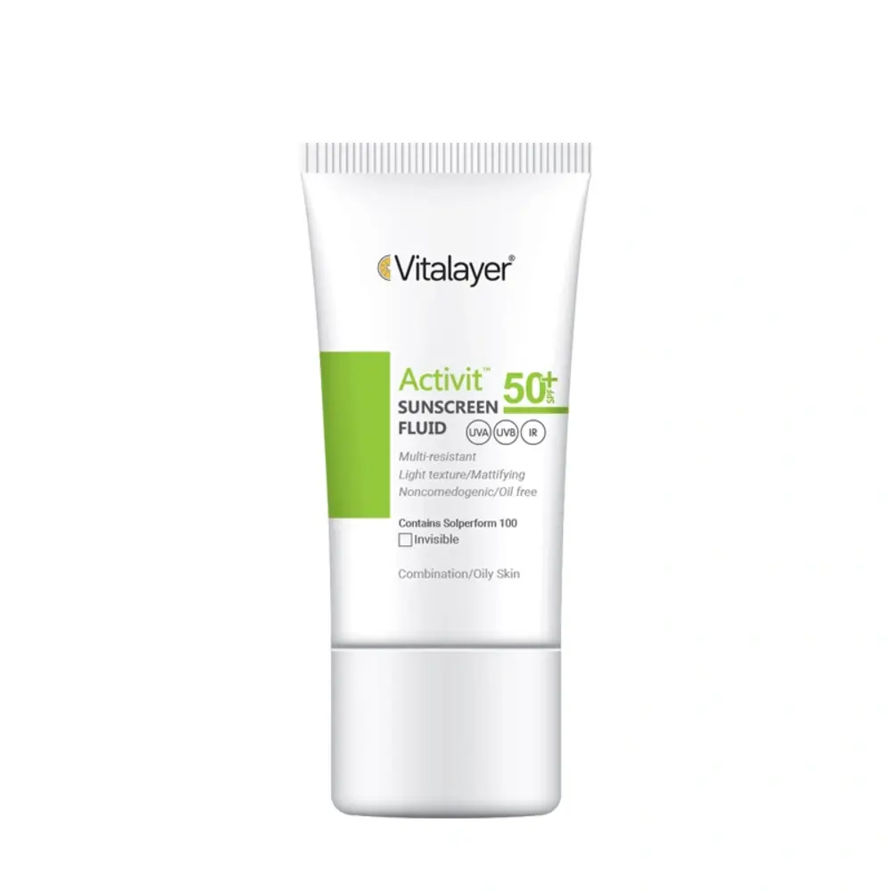 فلوئید ضد آفتاب ویتالیر مدل Activit با SPF50 و حجم ۵۰ میلیلیتر، یک ضدآفتاب تخصصی و سبک برای پوستهای چرب و مختلط است. این محصول با بهرهگیری از فیلترهای پیشرفته UVA و UVB، از پوست در برابر آسیبهای نور خورشید محافظت میکند، بدون آنکه حس چربی یا سنگینی ایجاد کند.